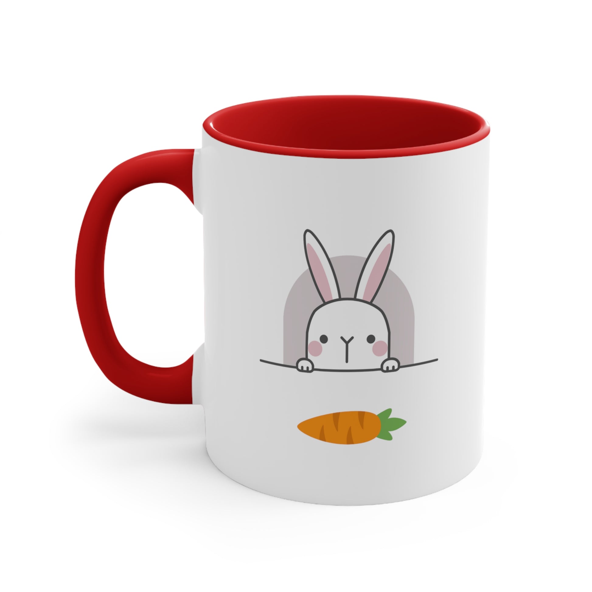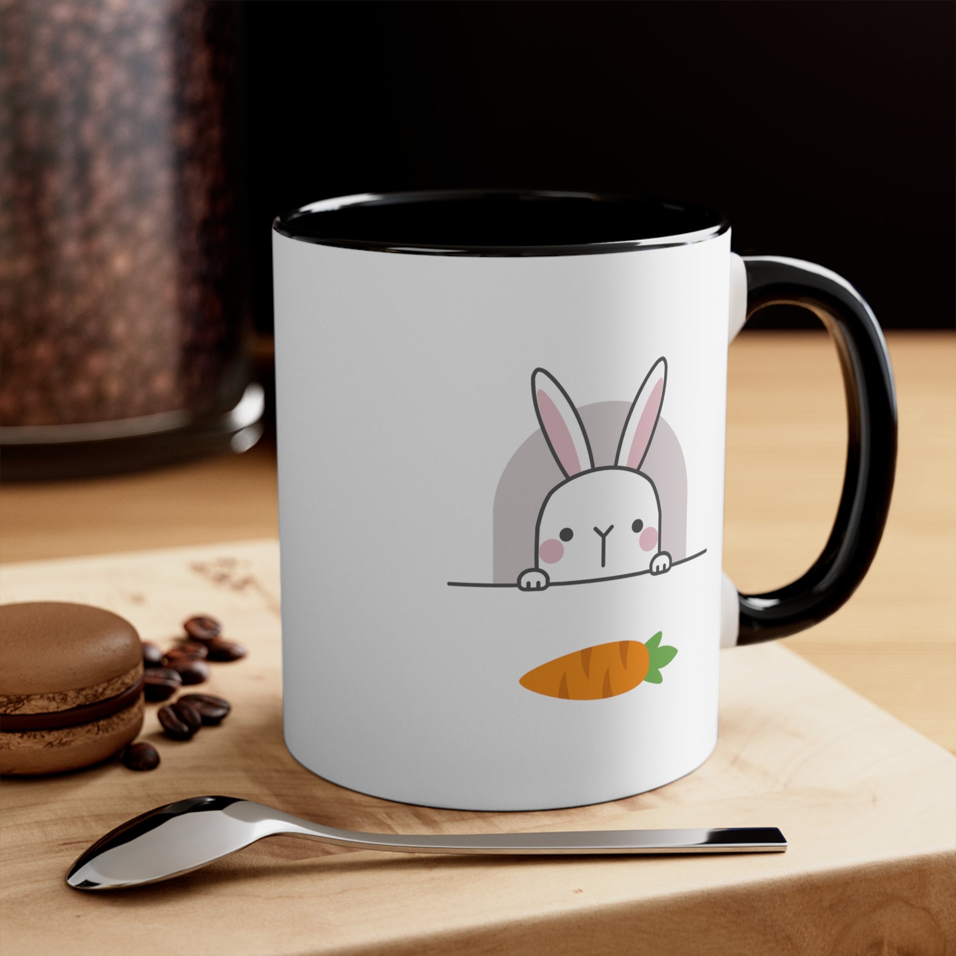 Get ready to elevate your coffee experience with our charming and unique Bunny Peeking Coffee Mug! This delightful 11 oz two-tone mug features an irresistible design of a bunny playfully peeking over a table at a tantalizing carrot. It's the perfect gift for anyone seeking a fun coffee cup with a touch of whimsy and a dash of cuteness.