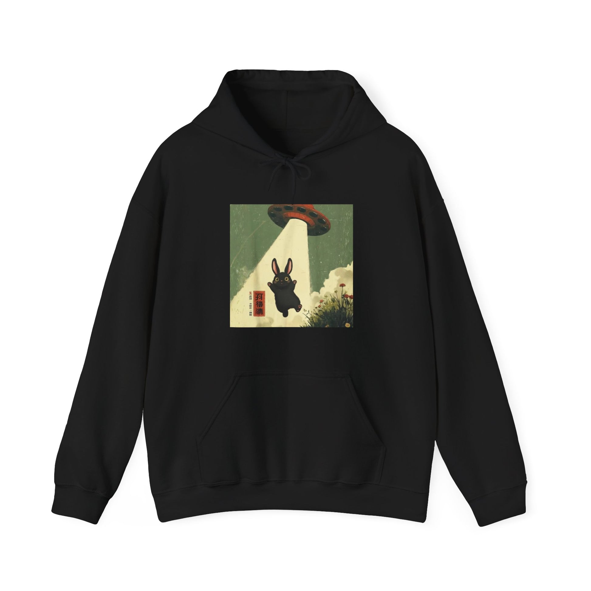 The Alien Bunny Abduction Hoodie features a surreal, retro-style illustration of a bunny being lifted into a UFO beam — blending vintage sci-fi aesthetics, quirky humor, and rabbit charm into one unforgettable hoodie.