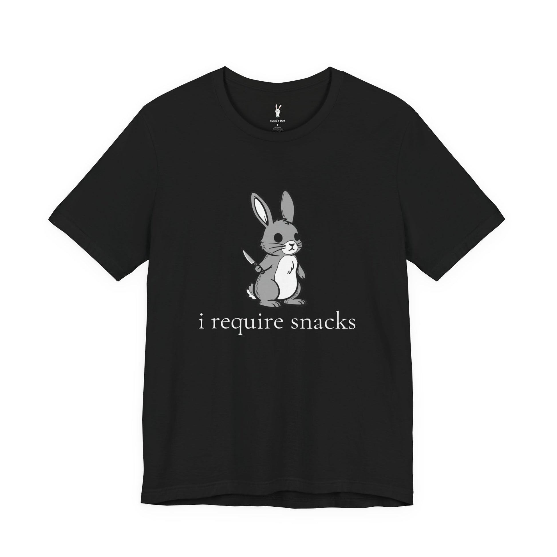 The I Require Snacks Bunny T-Shirt features an adorably grumpy bunny holding a tiny knife and delivering a very clear message: snacks are not optional. This design blends dark humor, bunny chaos, and relatable hunger energy into a graphic tee that instantly gets laughs.