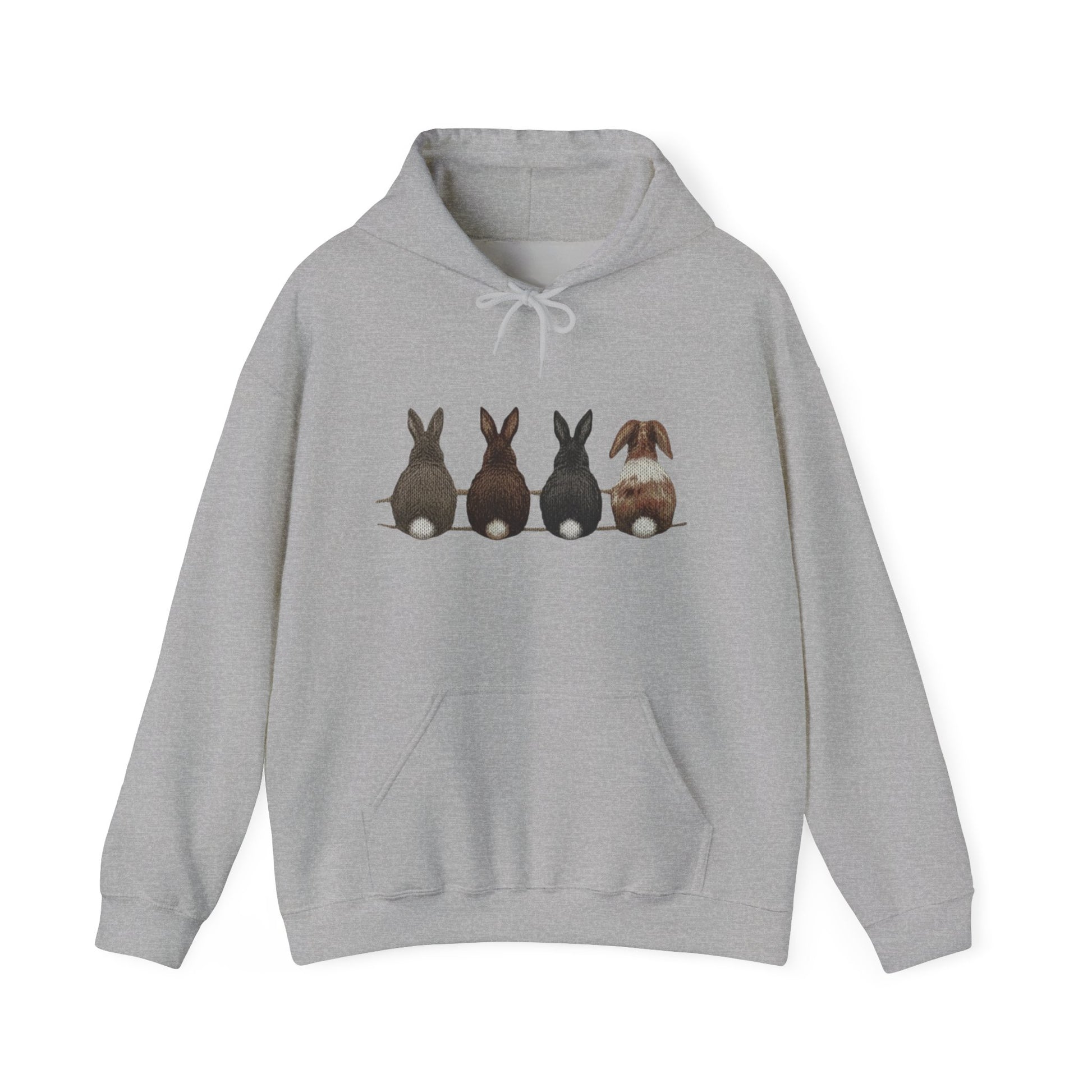 Our “Cotton Tail Crew” Bunny hoodie features four adorable bunnies sitting side by side, each showing off their irresistibly fluffy little tails. It’s the perfect blend of cozy and cute — whether you’re lounging at home, heading out for a casual day, or showing off your bunny love in style.