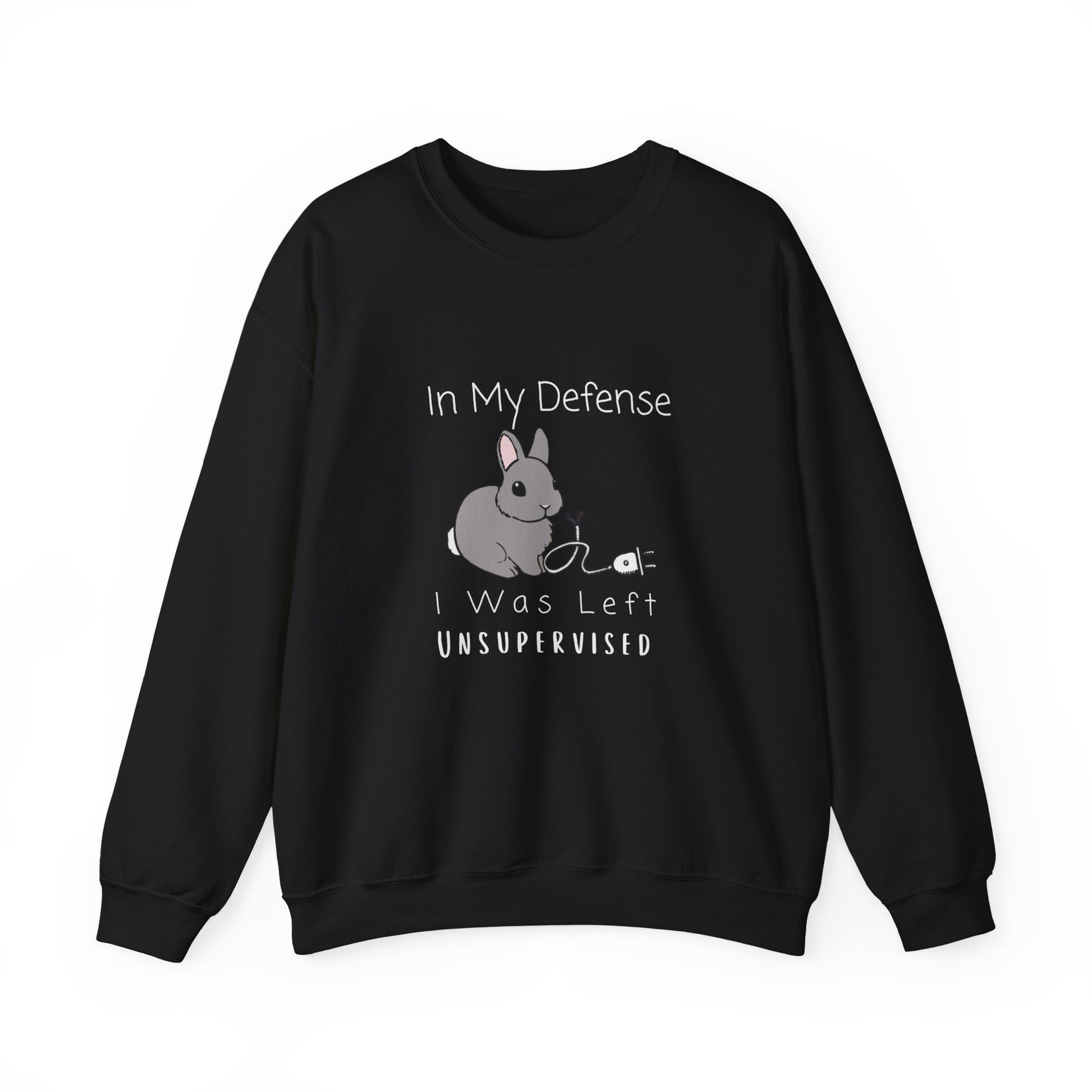 Bring on the giggles with this irresistibly cute bunny sweatshirt, designed for rabbit lovers who appreciate playful humor. This cozy graphic sweatshirt features an adorable gray bunny caught red-handed nibbling on a power cord, paired with the funny phrase “In My Defense, I Was Left Unsupervised.” Perfect for casual wear, lounging, or gifting, this rabbit-themed sweatshirt combines comfort, charm, and personality. A must-have funny bunny sweatshirt for animal lovers who enjoy lighthearted style and cozy vibes.
